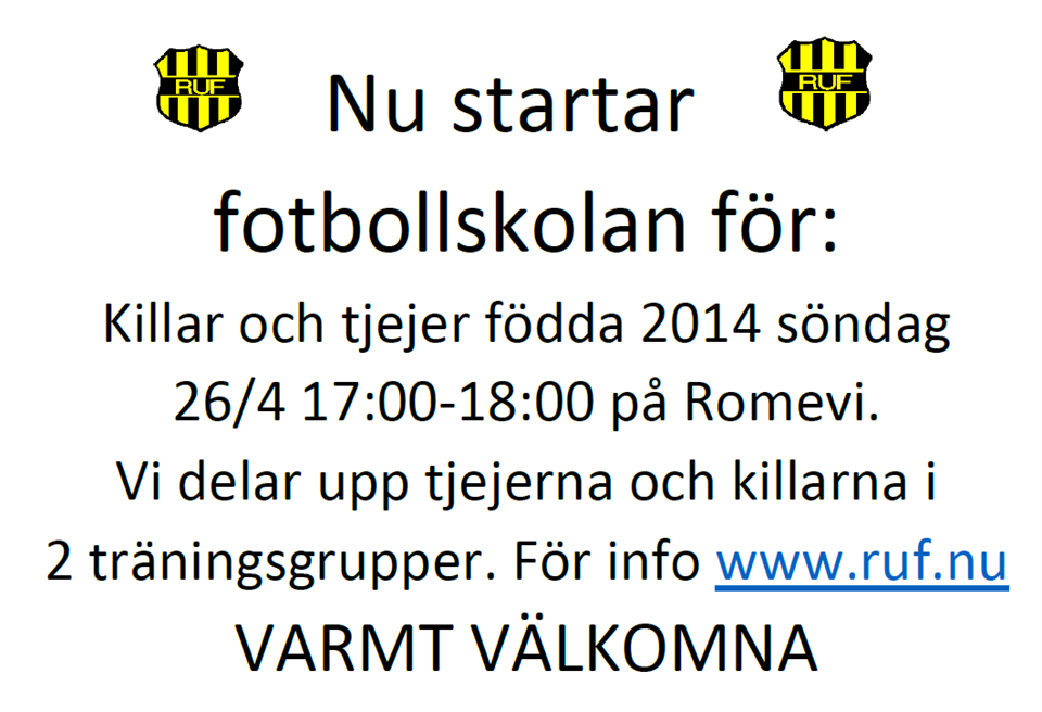 Söndag 26/4 17:00-18:00 så börjar vi fotbollskolan för flickor och pojkar födda 2014 på Romevi. Vi kommer att träna samma tid men i 2 olika grupper. De första gångerna kommer det att komma spelare från herrseniorerna och hålla i träningarna. Tänk på att inte komma för många anhöriga och att vi håller avstånd. Vid frågor maila kansliet@ruf.nu VARMT VÄLKOMNA TILL ROMEVI