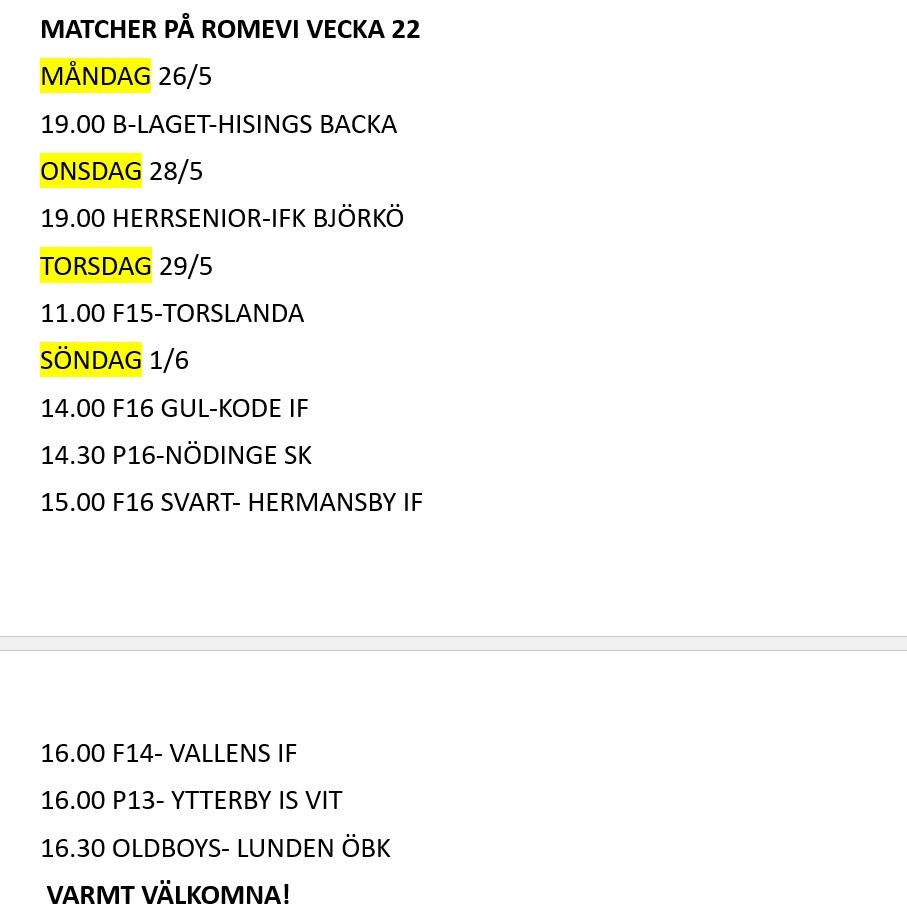 MATCHER PÅ ROMEVI VECKA 22 MÅNDAG 26/5 19.00 B-LAGET-HISINGS BACKA ONSDAG 28/5 19.00 HERRSENIOR-IFK BJÖRKÖ TORSDAG 29/5 11.00 F15-TORSLANDA SÖNDAG 1/6 14.00 F16 GUL-KODE IF 14.30 P16-NÖDINGE SK 15.00 F16 SVART- HERMANSBY IF 16.00 F14- VALLENS IF 16.00 P13- YTTERBY IS VIT 16.30 OLDBOYS- LUNDEN ÖBK VARMT VÄLKOMNA! Romelanda UF 26 maj 0kommentarer