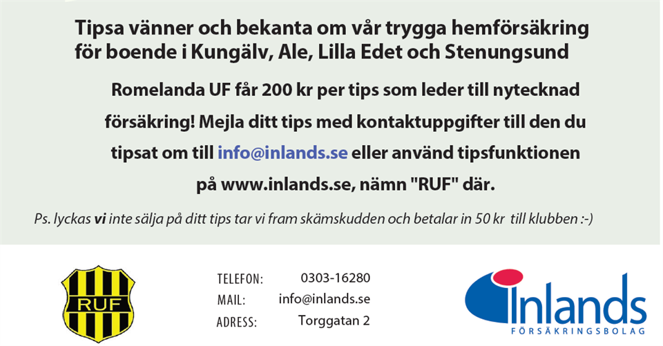 Här kommer ett erbjudande från vår sponsor Inlands Försäkringsbolag. Ligger även här Erbjudande från Inlands Försäkringsbolag Så in och tipsa vänner och kollegor så bidrar de med en slant till RUF om det blir något av tipset eller ej.