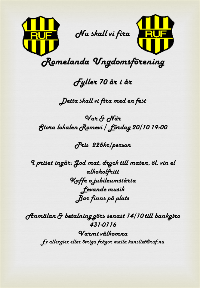Nu skall vi fira Romelanda Ungdomsförening Fyller 70 år i år detta skall vi fira med en fest Var & När: Stora lokalen Romevi / Lördag 20/10 19:00 Pris 225kr/person I priset ingår: God mat, dryck till maten, öl, vin el alkoholfritt Kaffe o jubileumstårta Levande musik Bar finns på plats Anmälan & betalning görs senast 14/10 till bankgiro 431-0116 Varmt välkomna Ev allergier eller övriga frågor maila kansliet@ruf.nu