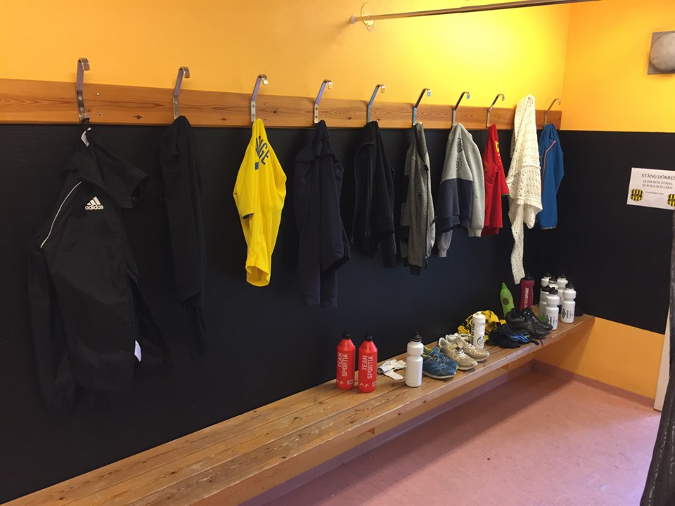 Upphittade kläder, skor m.m. efter Idrottens dag. Allt finns i 5’ans omklädningsrum.