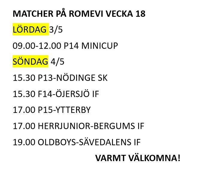 MATCHER PÅ ROMEVI VECKA 18 LÖRDAG 3/5 09.00-12.00 P14 MINICUP SÖNDAG 4/5 15.30 P13-NÖDINGE SK 15.30 F14-ÖJERSJÖ IF 17.00 P15-YTTERBY 17.00 HERRJUNIOR-BERGUMS IF 19.00 OLDBOYS-SÄVEDALENS IF VARMT VÄLKOMNA!