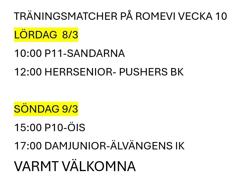 TRÄNINGSMATCHER PÅ ROMEVI VECKA 10 LÖRDAG 8/3 10:00 P11-SANDARNA 12:00 HERRSENIOR- PUSHERS BK SÖNDAG 9/3 15:00 P10-ÖIS 17:00 DAMJUNIOR-ÄLVÄNGENS IK VARMT VÄLKOMNA