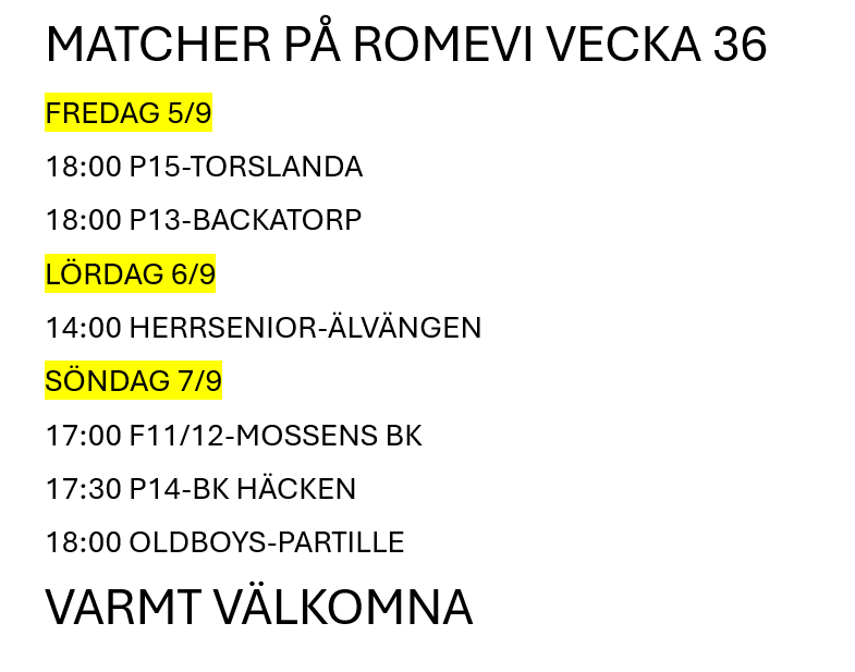 MATCHER PÅ ROMEVI VECKA 36 FREDAG 5/9 18:00 P15-TORSLANDA 18:00 P13-BACKATORP LÖRDAG 6/9 14:00 HERRSENIOR-ÄLVÄNGEN SÖNDAG 7/9 17:00 F11/12-MOSSENS BK 17:30 P14-BK HÄCKEN 18:00 OLDBOYS-PARTILLE VARMT VÄLKOMNA